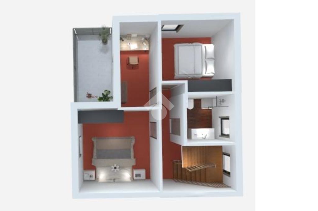 Dal corridoio, la scala porta al secondo piano, in cui è presente un camino e un terzo servizio. Questo piano si presta a essere utilizzato come ulteriore camera da letto, come studio personale o sala relax. Questo ambiente, inoltre, presenta delle affascinanti travi a vista.